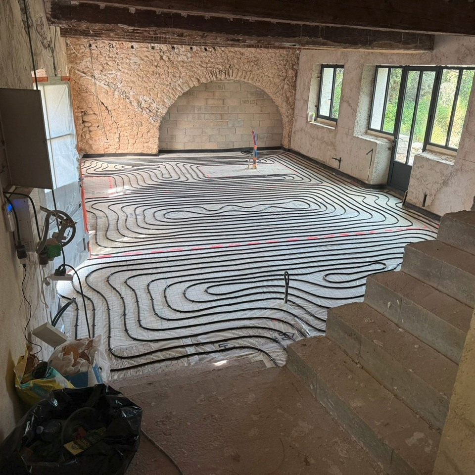 Notre รฉquipe vient de finaliser l’installation d’un plancher chauffant / rafraรฎchissant alimentรฉ par pompe ร  chaleur air-eau dans le village du Barroux (Vaucluse, 84) !